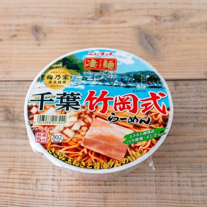 竹岡式ラーメンがすぐに味わえる即席麺です。竹岡式ラーメンはチャーシューを作った醤油がベースのラーメンで、チャーシューの旨味あふれるスープと食べ応えのあるちぢれ麺とチャーシューが特徴的です。
